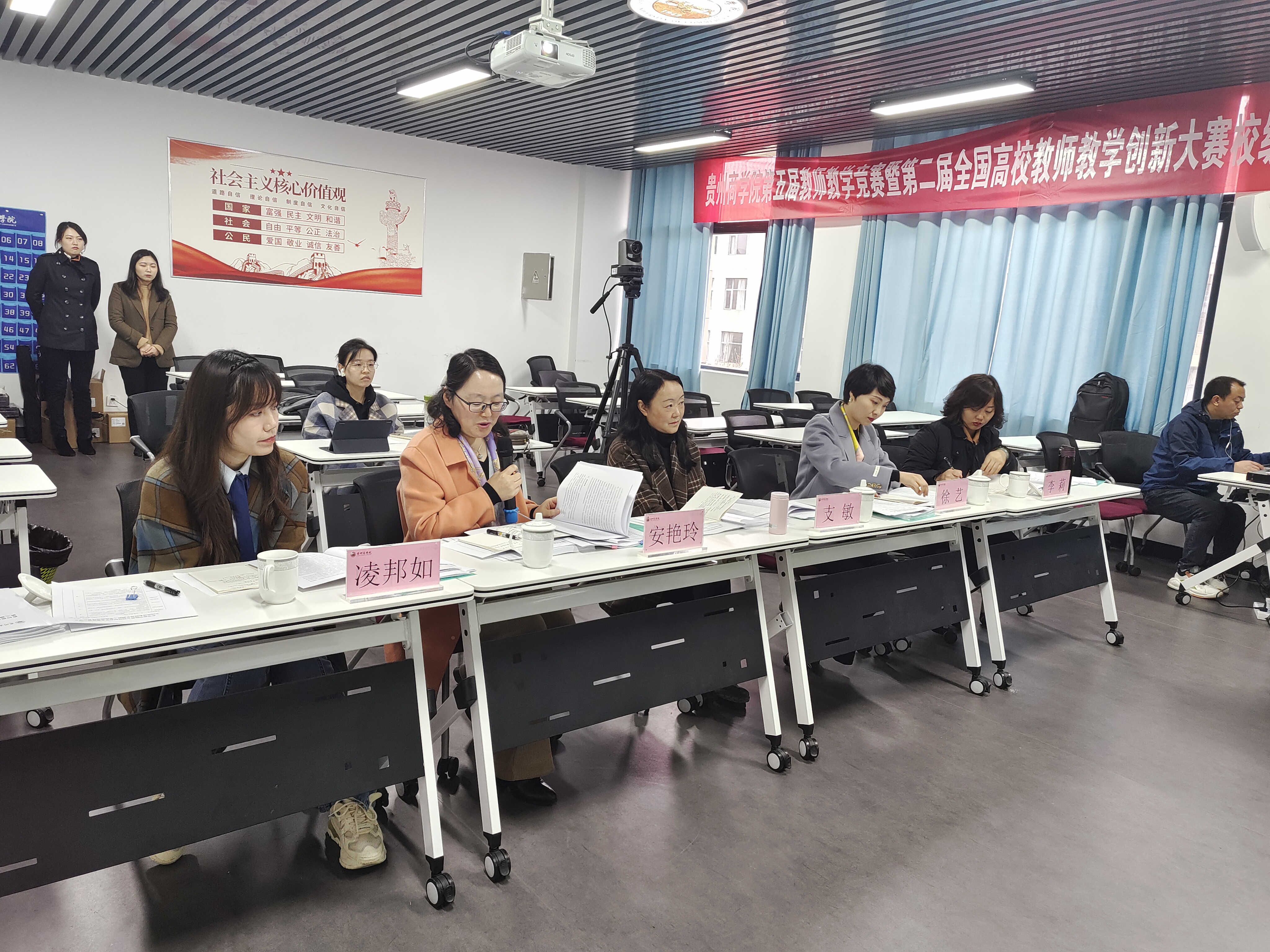 此次比赛,学校邀请有贵州师范大学支敏、贵州财经大学徐艺、贵州师范学院邓琴、贵州理工学院安艳玲、贵阳学院孟俊一等教务处领导以及我校韩军院长、李莉副院长、刘玲娅老师,同时也邀请到首届全国高校教师教学创新大赛高级组一等奖获得者许亮老师和中级及以下组三等奖获得者我校凌邦如老师作为比赛评委。