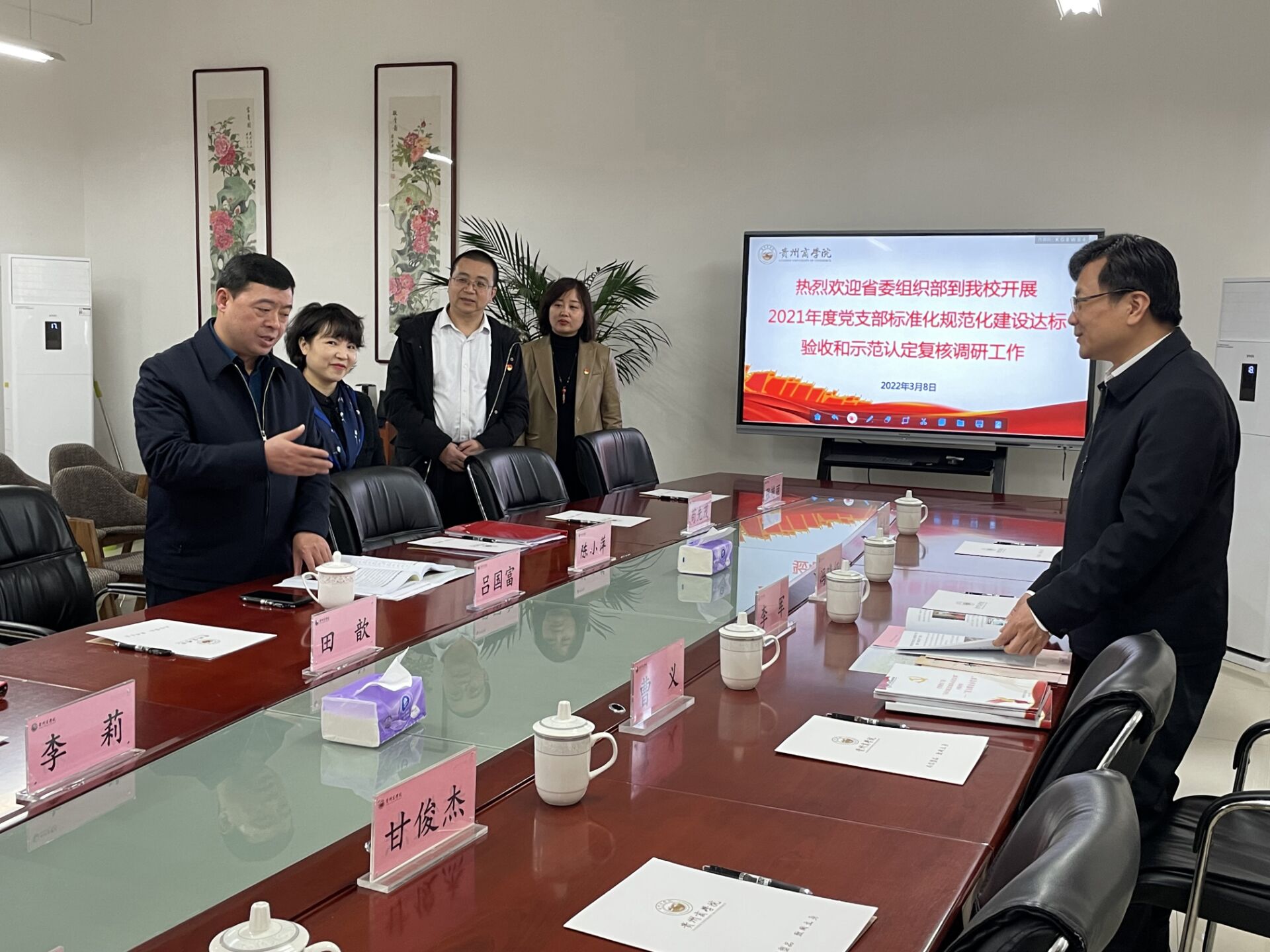 当天,由省委组织部组织一处处长、一级调研员李军率队的省委组织部调研组一行,到我校开展2021年度党支部标准化规范化建设达标验收和示范认定复核调研工作,对我校申报省级示范党支部的有关工作情况进行实地核查,并召开座谈会对相关工作进行指导和反馈。