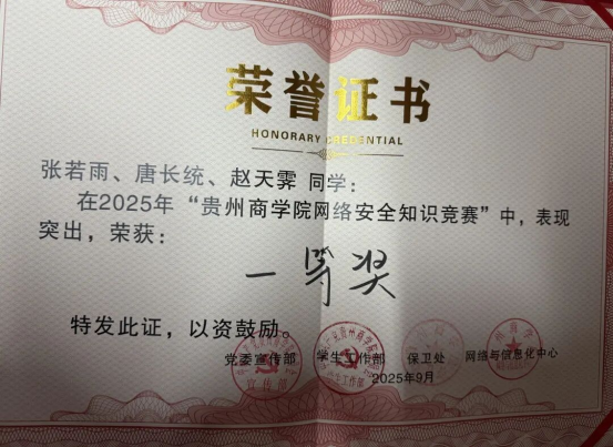 近日,2025年贵州商学院网络安全知识竞赛圆满落幕。国际教育学院精心组织,经严格选拔,最终确定由会展经济与管理H23-1班唐长统、H24-1班赵天霁、H24-2班张若雨三位同学代表学院参赛。在竞赛中,我院三位同学沉着冷静、默契配合,凭借扎实的网络安全知识储备、敏锐的反应能力,一路过关斩将,最终以95分的优异成绩斩获竞赛一等奖,分数遥遥领先。此次获奖,不仅是三位学子刻苦钻研、精益求精的成果,更充分彰显了国际教育学院在网络安全素养培育领域的扎实成效。希望我院全体同学进一步强化数字时代安全防护意识,锐意进取,再创佳绩!编辑:张馨月一审:赵天霁二审:赵雪杉三审:吴晶鑫