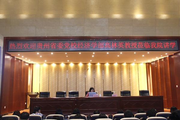 高林英教授主要研究领域为区域经济学、政治经济学和经济思想史,在省委党校各类干部培训班次讲授中国特色社会主义政治经济学专题课。此次讲座,高林英以党的十九大为主题以及中国共产党人的初心和使命为前言,为师生们引出了讲授的主题。她分别从习近平新时代中国特色社会主义经济思想的时代背景、习近平新时代中国特色社会主义经济思想的科学内涵和核心要义以及着力践行习近平新时代中国特色社会主义经济思想三个方面为我院师生深刻阐述了习近平新时代中国特色社会主义经济思想。高林英谈到:习近平新时代中国特色社会主义经济思想基于我国经济增长保持在合理区间、物价水平总体稳定、就业形势持续向好、国际收支保持平稳的良好时代背景以及经济发展面临的多重困难挑战应运而生,并从七个方面深刻阐述习近平新时代中国特色社会主义经济思想的科学内涵,同时也从七个方面为我院师生提出如何结合贵州经济发展实际,践行经济思想的丰富内涵和实践要求。