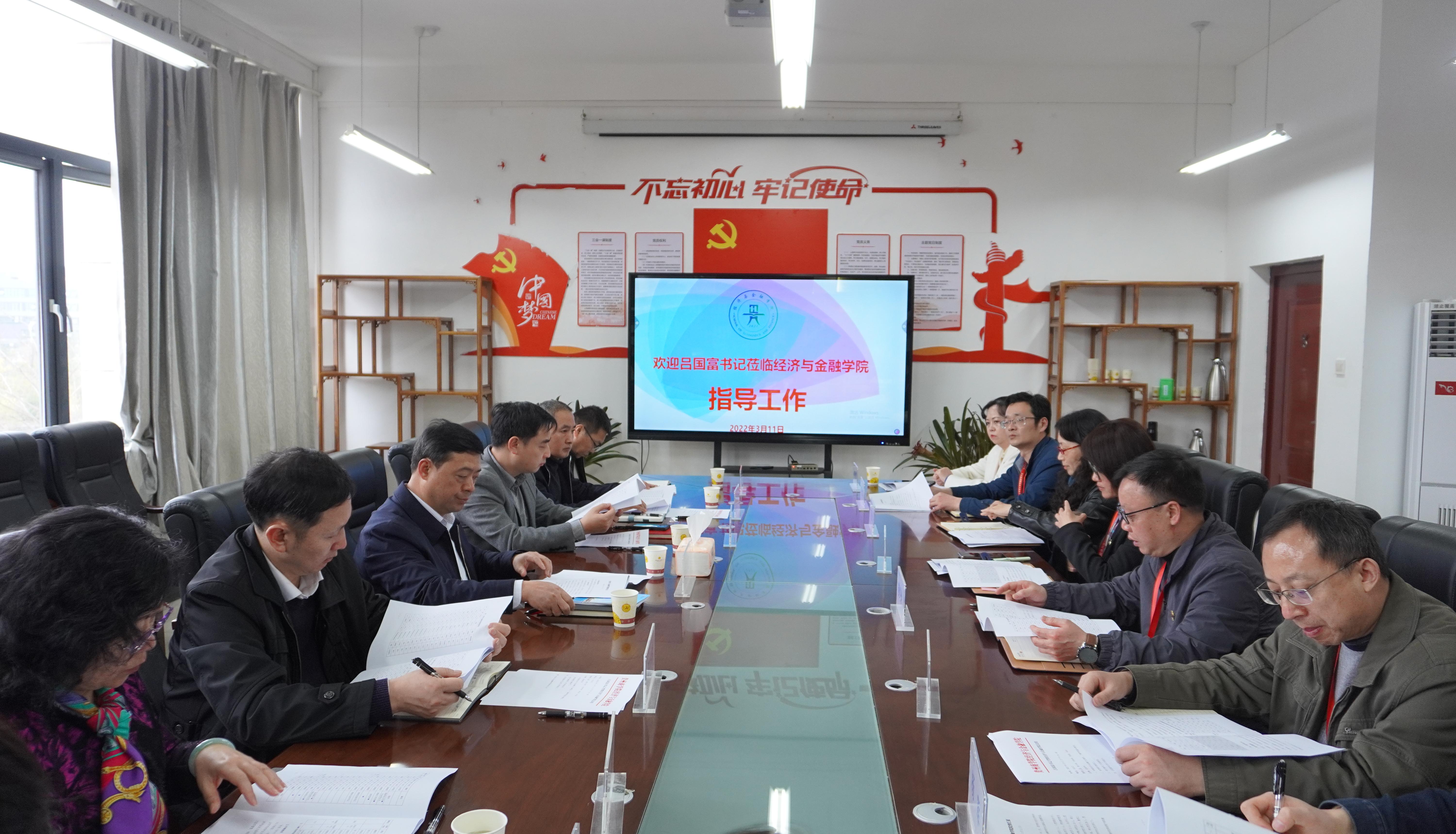 3月11日下午,党委书记吕国富到经济与金融学院调研指导工作,考察经济与金融学院文化建设、办公条件和环境等情况,看望慰问教职工代表并听取了经济与金融学院领导班子的工作汇报。