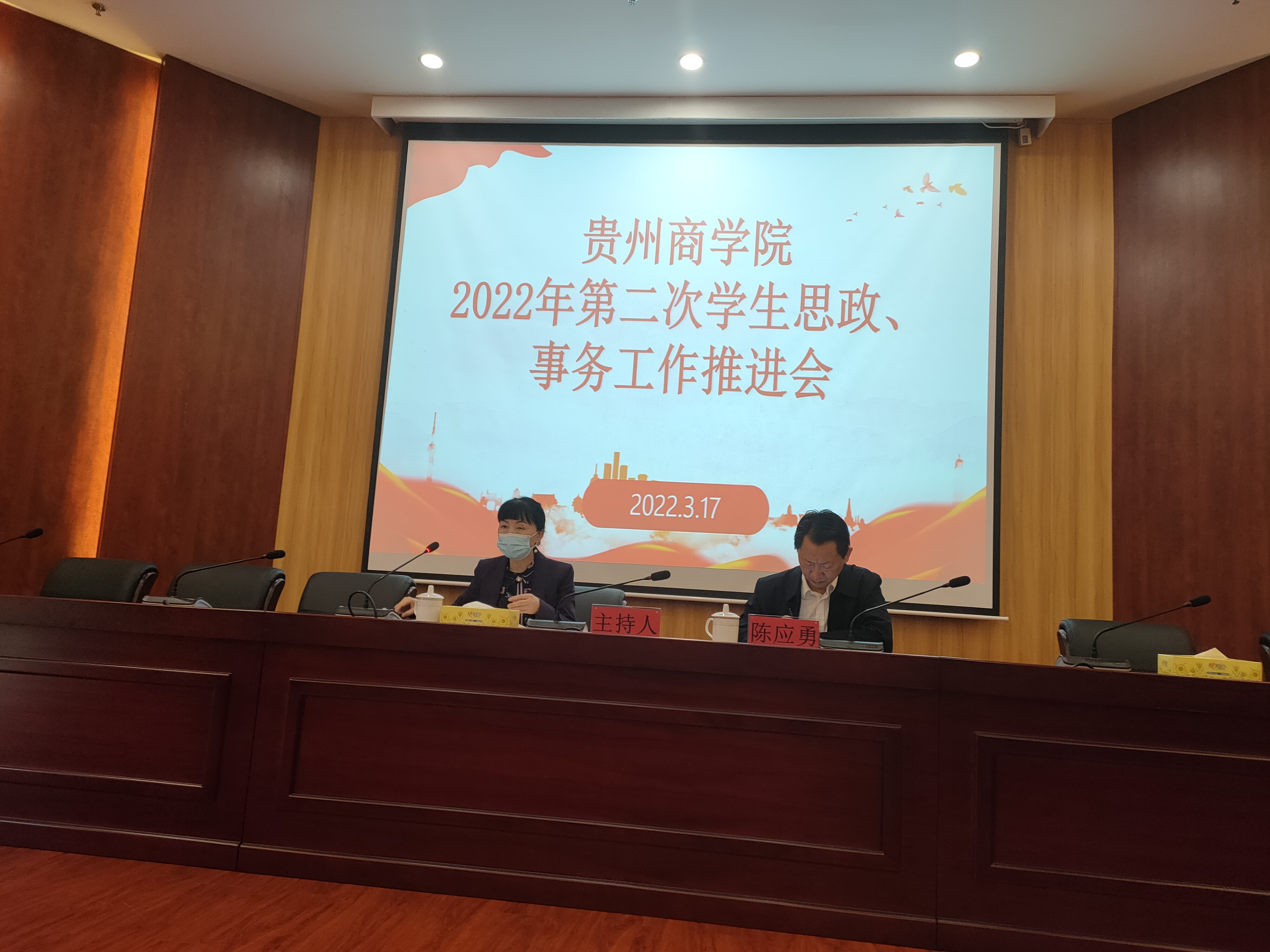 3月17日上午9:00,学校2022年第二次学生思政、事务工作推进会在湖滨会议中心第三会议室召开。校党委副书记陈应勇出席会议,各教学院部党总支副书记,保卫处、后勤处、学生处(招就处)负责人及相关工作人员参会。