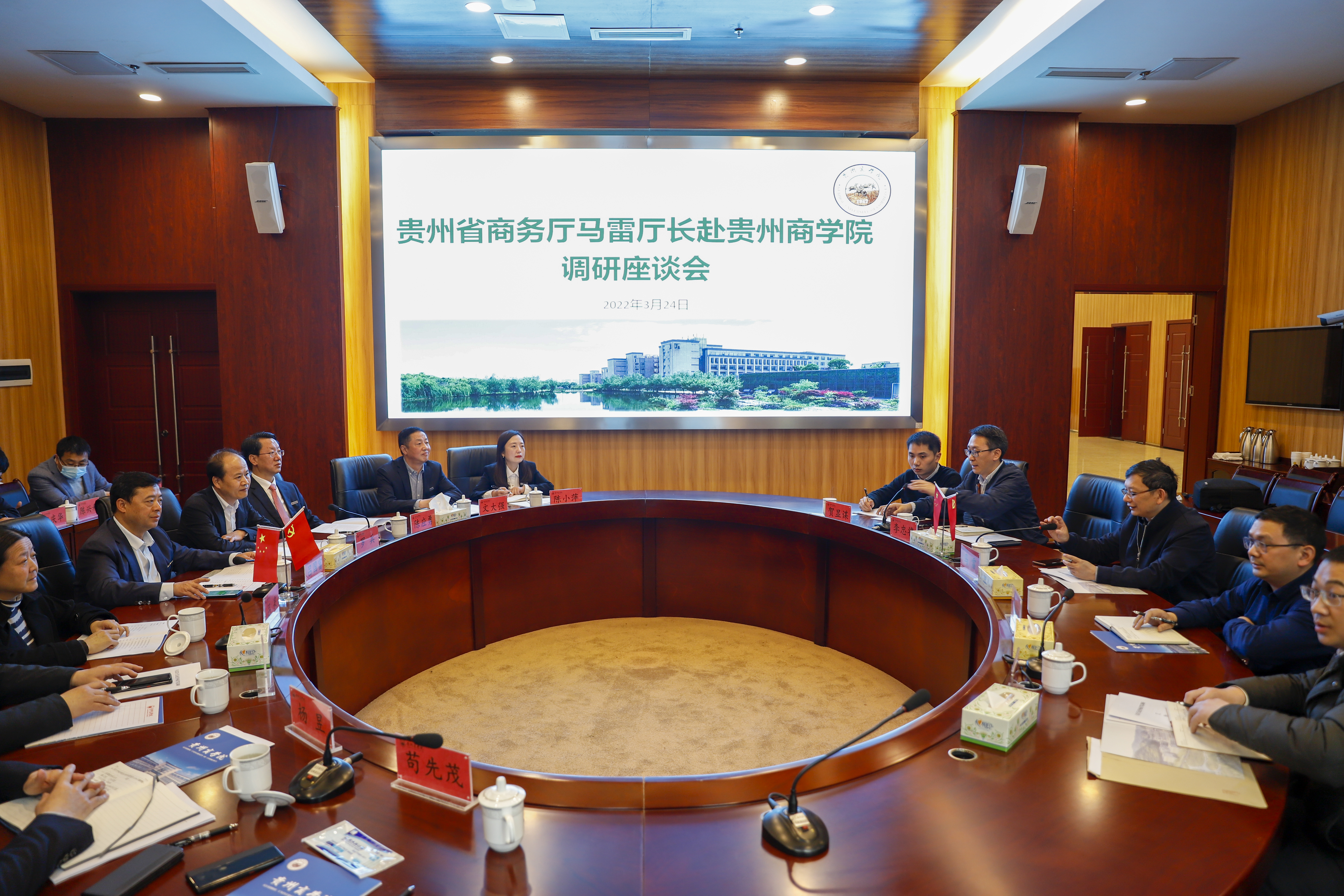 3月24日下午,贵州省商务厅厅长马雷来校调研指导,商谈厅校合作,学校党委书记吕国富、校长罗兵热情接待马雷厅长一行。