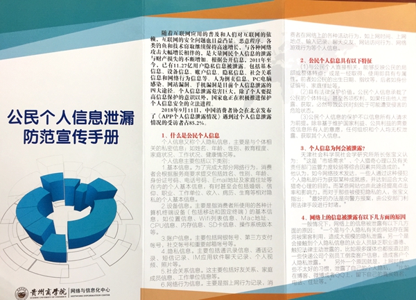 开学前夕,为增强广大教职员工防范个人信息泄露的意识,网络与信息化中心收集整理资料制作了《公民个人信息泄露防范宣传手册》,中心工作人员为全院教职员工发放宣传手册并热情讲解,共计发放宣传手册500余份。