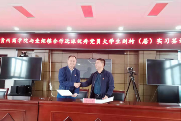 2019年10月21中午,党委组织部与麦架镇党委在麦架镇政府四楼会议室举行“贵州商学院与麦架镇合作选派优秀党员大学生到村(居)实习协议签订仪式”,党委组织部部长杨昱与麦架镇党委书记杨友荣分别代表校地双方签署了“合作选派优秀党员大学生到村(居)实习协议书”。