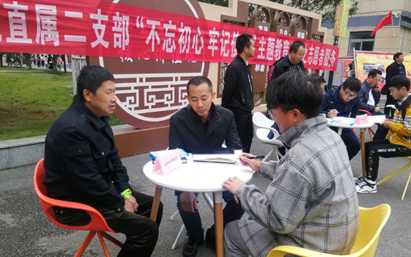 经直属二支部全体党员干部精心筹备,2019年10月24日中午由支部所属部门保卫处、后勤处、国资处全体党员干部参加的“不忘初心、牢记使命”主题教育志愿者服务活动在学院学生宿舍中庭举行,学院副院长陈应勇同志全程参与了此次活动。