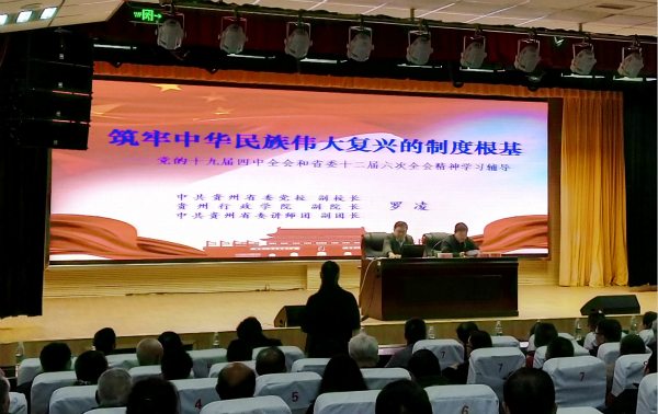 2019年11月26日下午三点,贵州省委老干部局在贵州老年大学二号楼三楼报告厅组织召开了2019年第四季度老干部形势报告会,会议由省委老干局部副局长保安华主持,中共贵州省委党校(贵州行政学院)副校长、中共贵州省委讲师团副团长罗凌作《筑牢中华民族伟大复兴的制度根基——党的十九届四中全会和省委十二届六次全会精神学习辅导》专题报告。贵州商学院离退休处党支部书记杨志军带领退休教授段鸣骅、郑晓云两位同志参加本次会议。