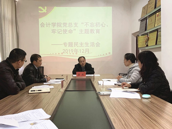 根据《贵州商学院关于基层党组织召开“不忘初心,牢记使命”专题民主生活会、专题组织生活会和开展民主评议党员的通知》,2019年12月9日下午,会计学院党总支召开“不忘初心、牢记使命”专题民主生活会,学院联系领导罗兵同志到会指导。