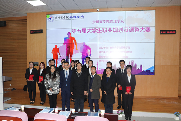 为全面普及大学生职业规划知识,传播生涯成长理念,2019年12月5日,管理学院在尚智楼3J103开展第五届职业生涯规划及调整大赛。贵州商学院副院长文大强,管理学院副院长曾方俊、党总支副书记赵翔出席活动,贵州合力超市集团吴兵主任、王晓明总监、毛诗淑主管,贵州绿通惠农大数据有限公司王永才董事、贵州百灵企业集团制药股份有限公司李琦经理应邀担任本次大赛的评委。由文大强院长向出席大赛的企业嘉宾致欢迎词。