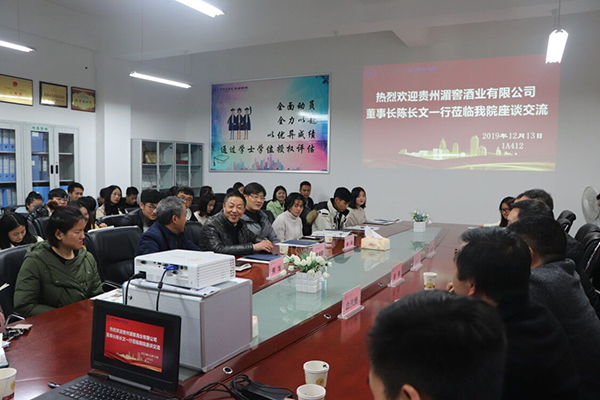 2019年12月13日,贵州湄窖酒业有限公司董事长陈长文一行莅临贵州商学院管理学院进行座谈交流。学院副院长管理学院院长文大强、实践教学中心主任何旭、管理学院党总支副书记赵翔、管理学院学工办负责人、市场营销专业教研室负责人等教师代表出席座谈会,管理学院2020届毕业生代表60余人参加了座谈交流。