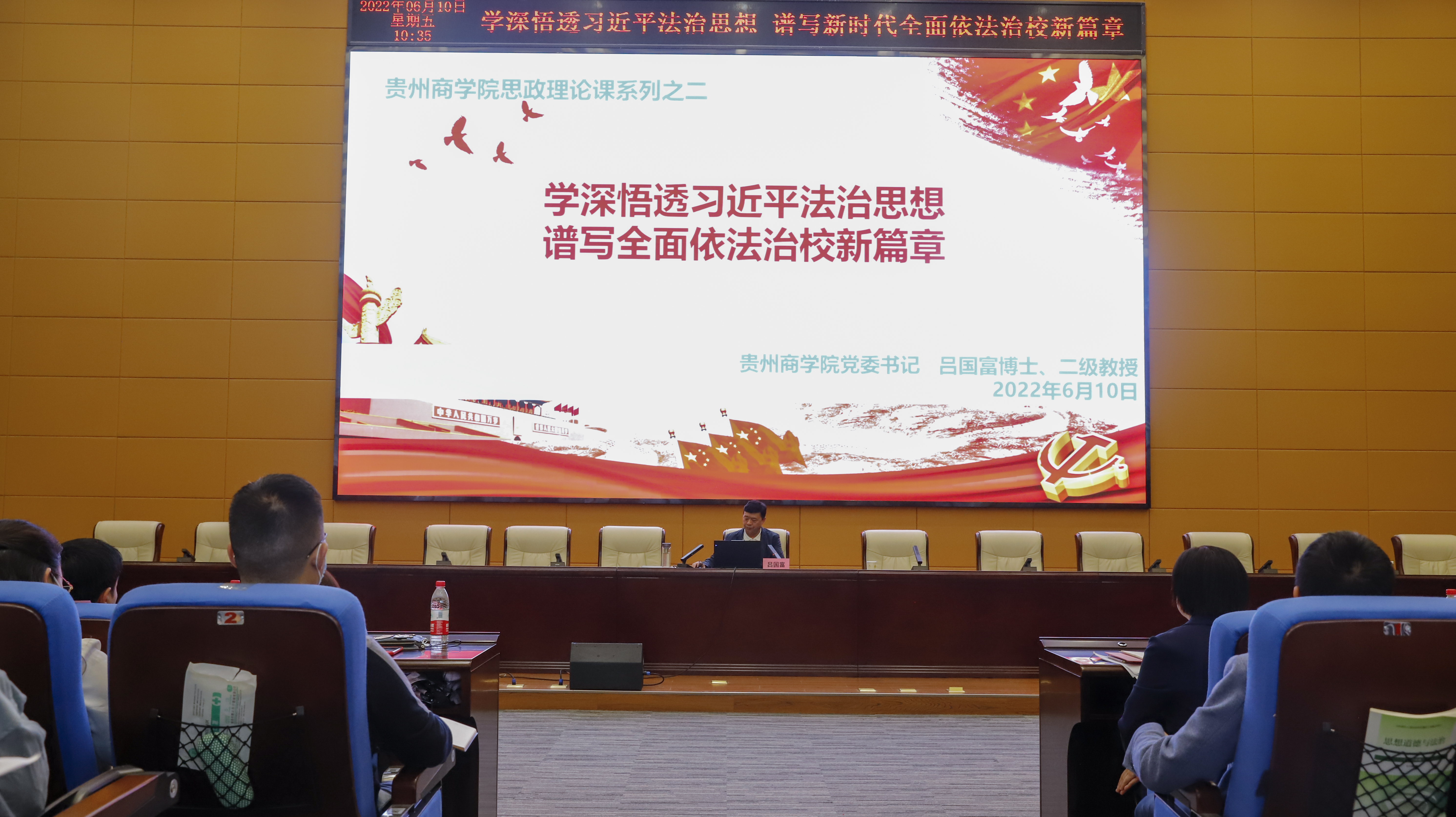 吕国富要求,要把习近平法治思想贯穿于办学治校、人才培养的各方面和全过程。全面推进依法治校,要抓住领导干部这个“关键少数”。全校各级党员干部一定要带头尊崇法治、敬畏法律,运用法治思维和法治方式开展工作,做尊法学法守法用法的模范。全校上下要深入贯彻落实立德树人根本任务,发扬学校75年优良办学传统,完善学校教学、科研、管理制度,提升治理效能,为建设高水平新型商科院校提供更加坚实的制度保障,谱写全面依法治校新篇章。要把学习习近平法治思想与人才培养工作紧密结合,推动习近平法治思想进教材、进课堂、进头脑,努力推动学校法学教育和理论实践取得新成绩。