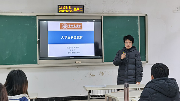2019年12月24日下午2:00在尚文楼B203教室,文化与艺术传媒学院特邀请贵州商学院马克思主义学院的法学博士任文华老师来院,为我院所有专兼职辅导员老师作题为“大学生安全教育”的讲座培训。