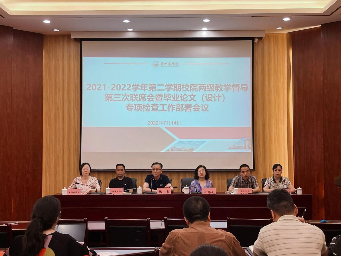 7月14日,我校在湖滨会议中心第四会议室召开了2021-2022学年第二学期校院两级教学督导第三次联席会暨毕业论文(设计)专项检查工作部署会议。党委委员、副校长张勇出席会议,校院两级教学督导组全体成员、参加毕业论文(设计)专项检查工作的相关教师、教务处、实践教学中心、教师工作部(处)、教育评估中心负责人参加会议。会议由教育评估中心主任成蕴琳主持。