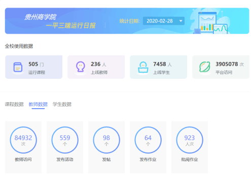 在教师实施线上教学的同时,教务处通过超星公司提供的“贵州商学院教学实时数据监控”、“一平三端”运行日报及学院自行设计的教学日志填报等方式对教师在线教学、学生在线学习、课程内容、教学过程和平台运行进行监管,保证了线上教学安全平稳。