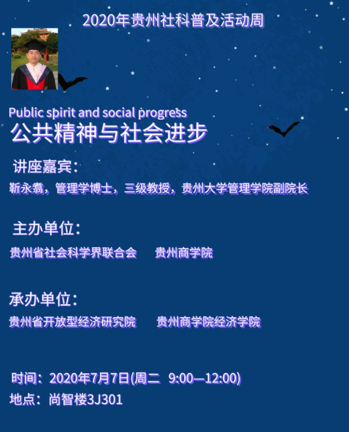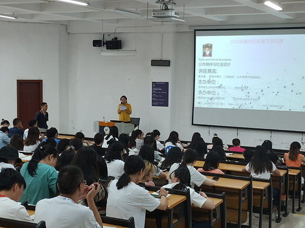 7月7日,2020年贵州社科普及活动周的宣传活动走进贵州商学院,由贵州省社会科学界联合会和贵州商学院共同主办、贵州省开放性经济研究院和贵州商学院经济学院承办的宣传活动在尚智楼3J301举行。活动邀请到贵州大学公共管理学院副院长、硕士生博士生导师靳永翥教授做主题为“公共精神与社会进步”的讲座,活动由经济学院蔺琛副院长主持,全校240名同学参加。