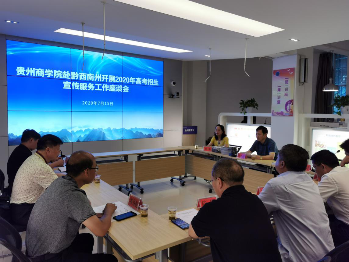 招生宣传组一行在黔西南州教育局会议室举行了2020年高考招生宣传服务工作座谈会,对学院办学定位、新商科办学特色、中外合作办学项目特色和优势等进行了详细的介绍和解答。会议由黔西南州教育局领导主持,兴义二中等10余所中学校长或招生工作负责人参加座谈。