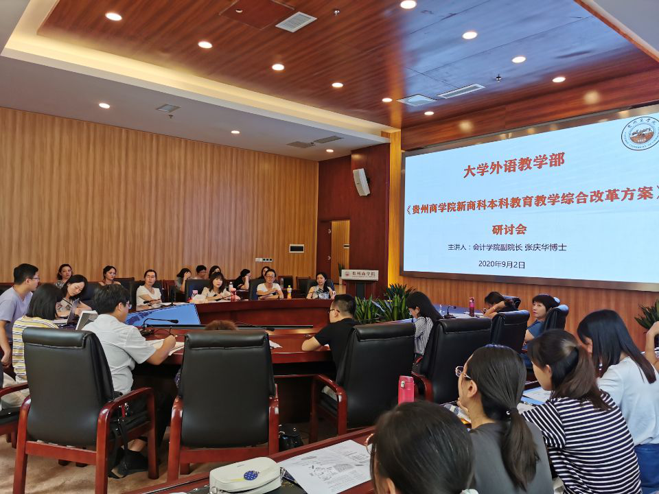 为加深部门全体教职工对《贵州商学院新商科本科教育教学综合改革方案》的理解,促进方案在部门落地见效,2020年9月2日下午,大学外语教学部(国际教育学院)在静心湖会议室召开了《贵州商学院新商科本科教育教学综合改革方案》学习研讨会,荣幸邀请到改革方案核心撰写成员会计学院副院长张庆华博士到会对改革方案进行讲解,会议由大外部汪阳副主任主持,部门全体教职工参加。