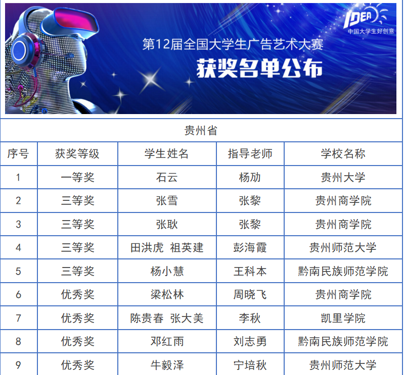 年的第十二届大广赛,全国共有535982组作品参赛,参赛大学生达112万人次。在最终入围全国总评审的30589组作品中,我校文化与艺术传媒学院突出重围,喜获佳绩:张黎老师指导的张雪、张耿分别获得全国三等奖,周晓飞老师指导的梁松林获得全国优秀奖。