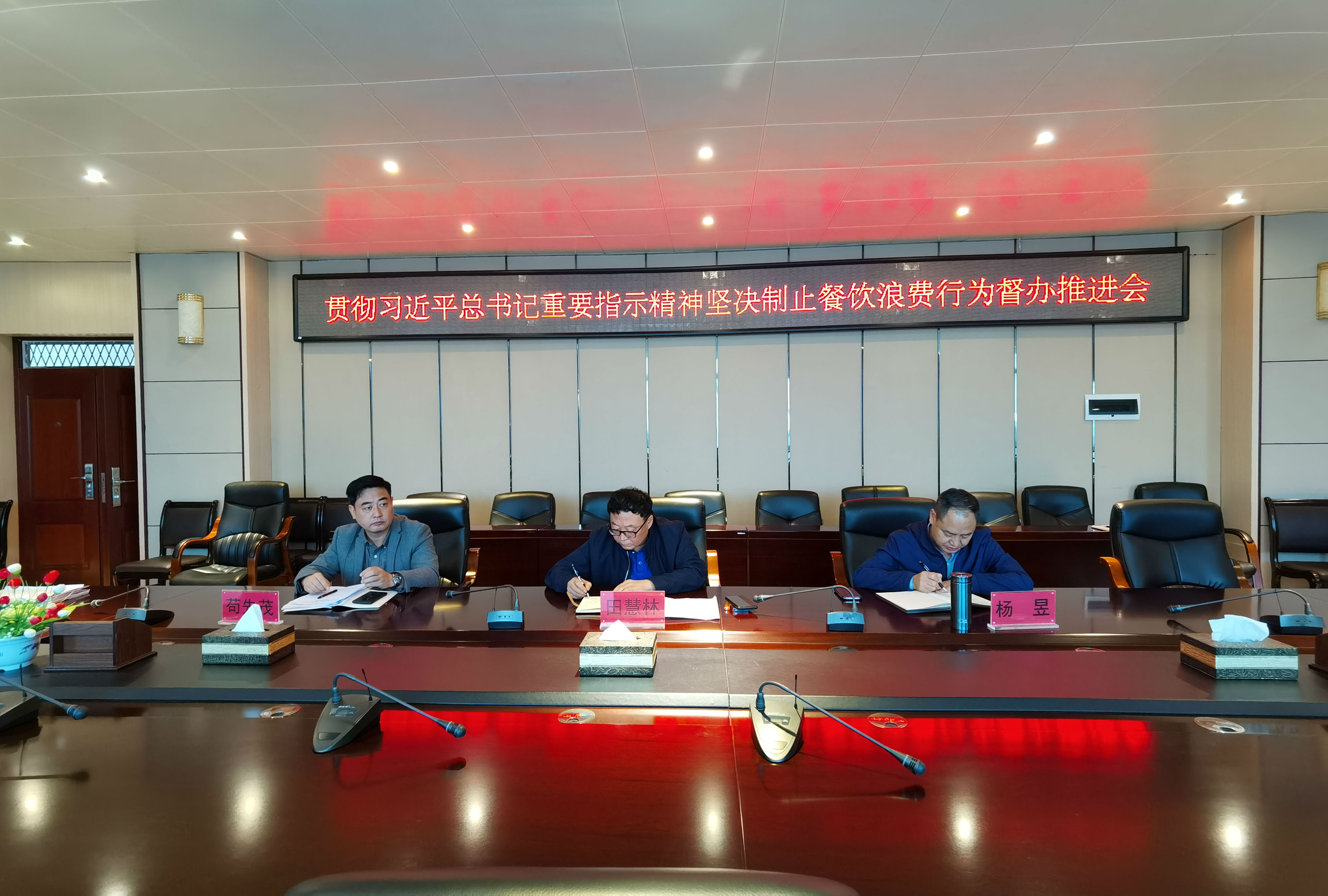 学院纪委书记、监察专员田慧林同志传达了习近平总书记对制止餐饮浪费行为作出的重要批示,省委办公厅、省政府办公厅《关于厉行节约坚决制止餐饮浪费行为的通知》、省教育厅《关于坚决制止餐饮浪费培养节约习惯的通知》等文件精神,要求有关部门负责人要贯彻落实学院领导在相关会议和文件批示中对落实总书记批示精神的具体要求。