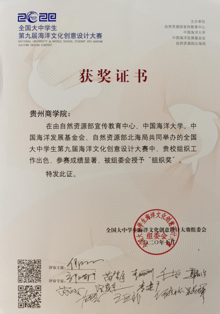 由于受到新冠肺炎疫情的影响,文传学院师生克服困难,在学院领导和老师的支持与帮助以及同学们对本届大赛的参与热情下,并荣获了2020全国大中学生海洋文化创意设优秀组织奖。