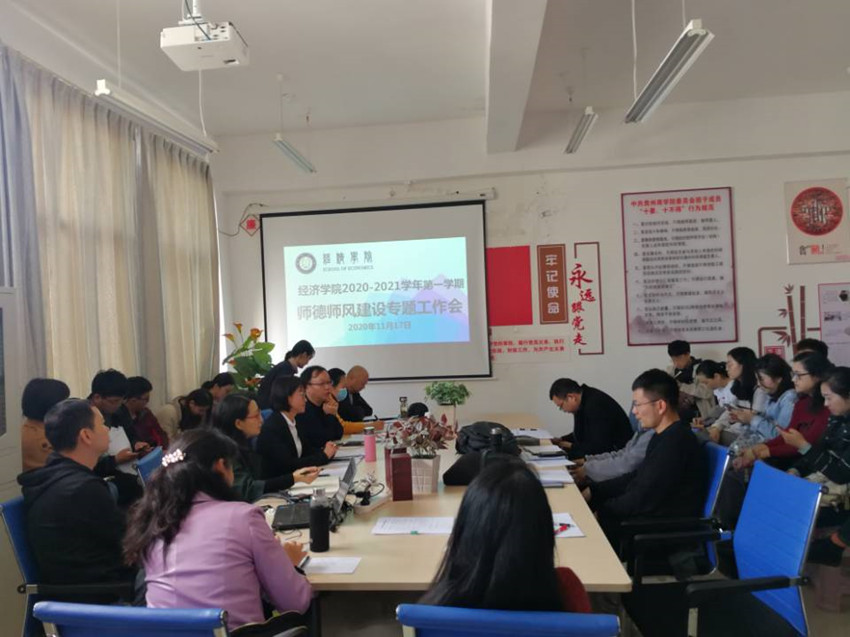 经济学院于2020年11月18日在学院廉政文化活动室召开了师德师风建设工作专题会议,会议由经济学院党总支书记庞郁华主持,经济学院党政班子成员和全体教职工参加了会议。