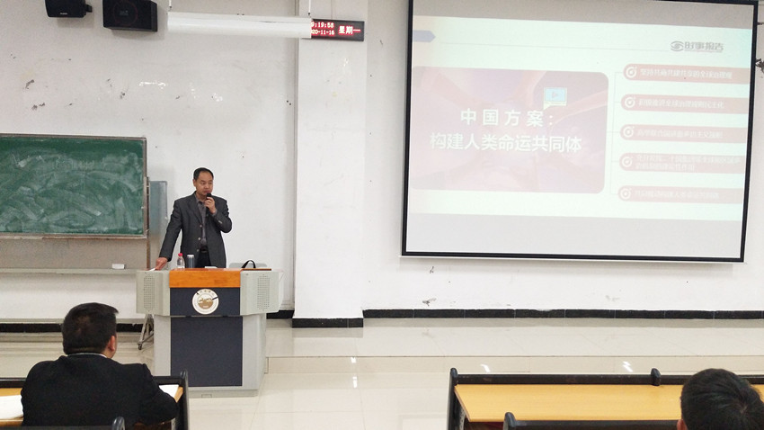 为增加同学对世界局势的关注度,贵州商学院副院长杨昱于11月16日在3J101为经济学院的同学开展了以“携手共建人类命运共同体”为主题的形势政策课。