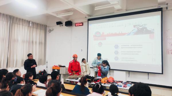 讲座开始,曾亮教授以真实的救援视频引导同学们进入本次讲座的主题。曾亮教授简单给同学们介绍了中国国际救援队的背景与组织架构,并在介绍过程中以火灾、地震为例,提问相关危机应对措施与同学们进行交流互动,拉近与同学们的距离以便更好的讲授应急知识以及公共事业管理(应急方向)专业的发展方向,同时使讲述内容更具现实性和说服力。曾教授在讲授过程中以事故灾难、自然灾害、公共卫生事件、社会安全事件四个板块为线索,向同学们徐徐展开。为了让同学们亲身体验,曾亮教授让同学们上台亲自感受基本救援装备的使用与认识,同时还把本地发生的一些突发事故为例,详细讲解应急管理在这中间应如何做、怎么做才能发挥重要作用。