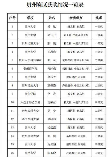 在贵州省教育厅的全程领航与贵州省高等教育学会的鼎力支持下,贵州赛区各参赛教师凝心备赛、奋勇争先,最终在国赛中荣获一等奖3项、二等奖5项、三等奖8项。