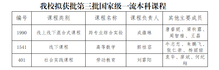 8月21日教育部公布《关于第三批国家级一流本科课程认定结果的公示》,我校三门课程成功入选,这是我校在国家级本科教学质量工程项目上取得的历史性突破,标志着我校课程建设水平迈上新台阶。