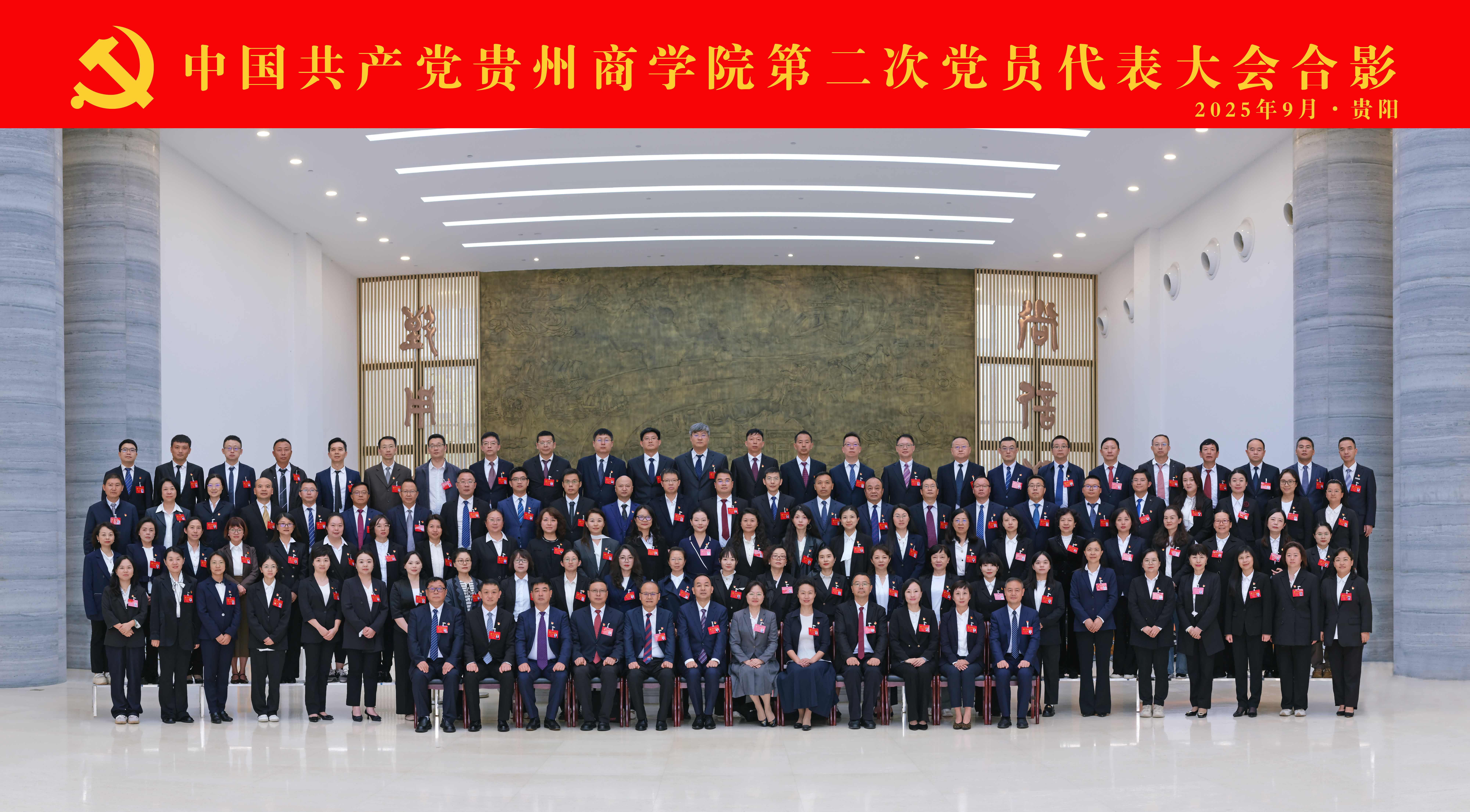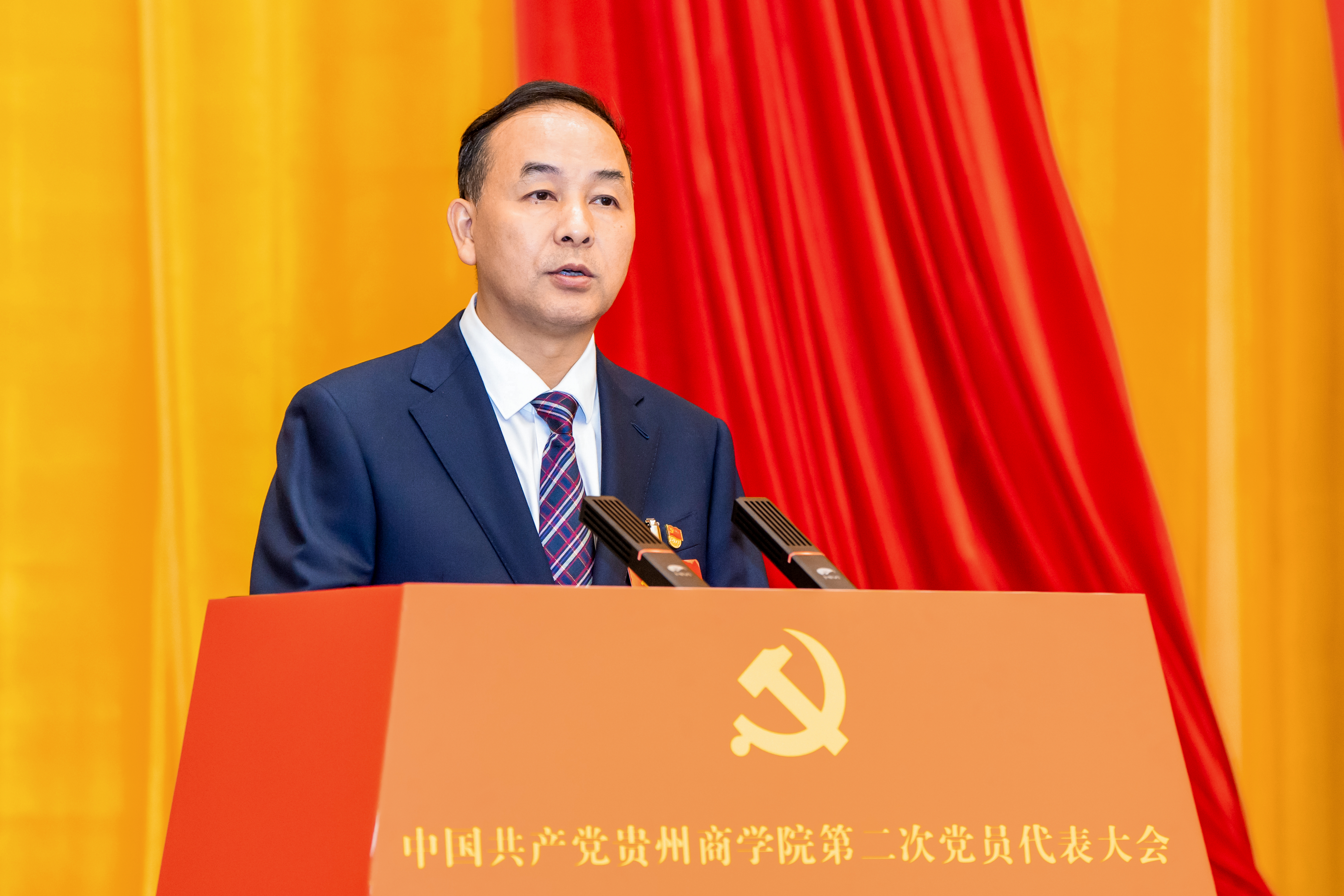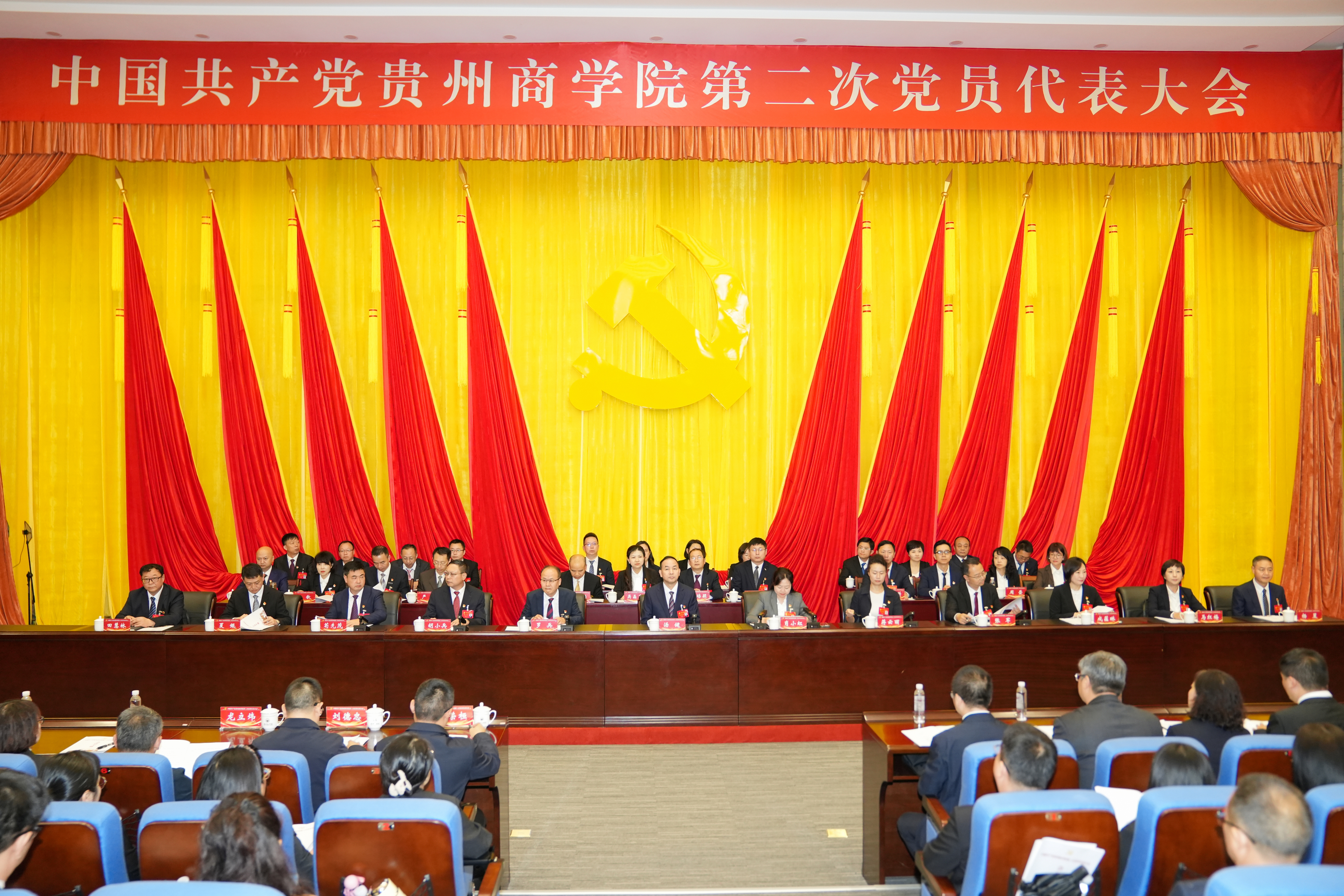 大会现场氛围庄重热烈,主席台上方悬挂着“中国共产党贵州商学院第二次党员代表大会”的会标,党徽在十面红旗映衬下熠熠生辉;全体代表身着正装、精神昂扬,带着过去五年学校发展的奋斗记忆,怀着对未来办学治校的美好期盼,齐聚一堂共商发展大计,共同开启学校高质量发展新征程。