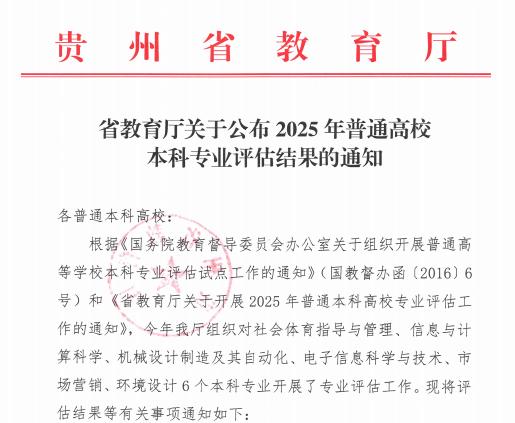 近日,贵州省教育厅印发《省教育厅关于公布2025年普通高校本科专业评估结果的通知》,此前,省教育厅对社会体育指导与管理、信息与计算科学、机械设计制造及其自动化、电子信息科学与技术、市场营销、环境设计6个本科专业组织开展了评估(获批国家一流本科专业院校不参与本次评估),经专家组定性打分、系统定量评分,结合高校申报数据及支撑材料综合评定,我校市场营销专业以95.95分(总分110分)的优异成绩,在全省参与评估院校中位列第一名,充分彰显了我校市场营销专业的办学实力与育人水平。