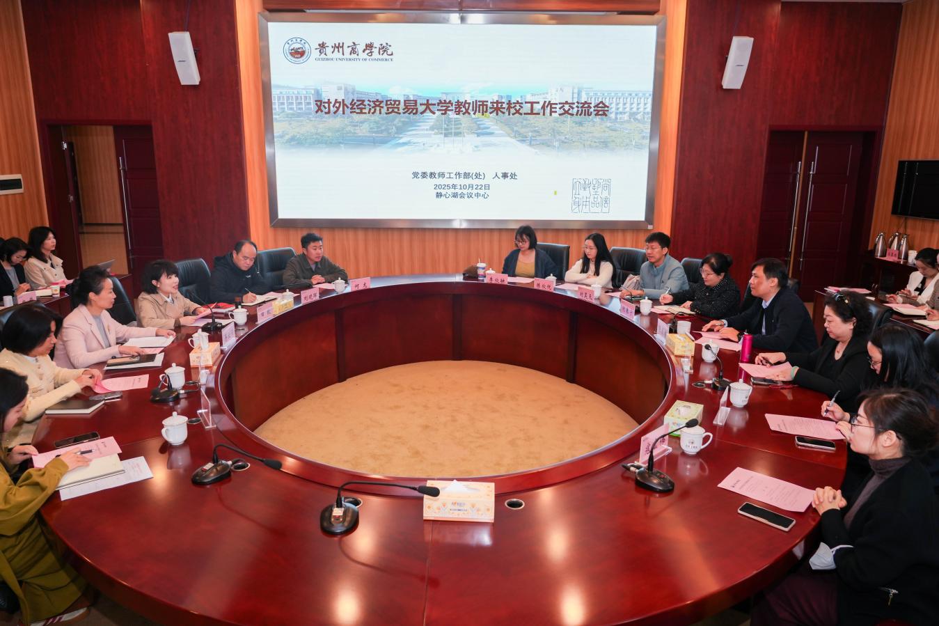 10月22日上午,贵州商学院与对外经济贸易大学交流合作会议在静心湖会议中心举行。党委副书记蒋云丽、对外经济贸易大学贵州对外开放研究院院长张磊楠、副院长孟丹梅、研究院办公室主任刘春宁以及对外经济贸易大学六名优秀青年教师参加了座谈。党委教师工作部(处)部(处)长田歆主持会议。