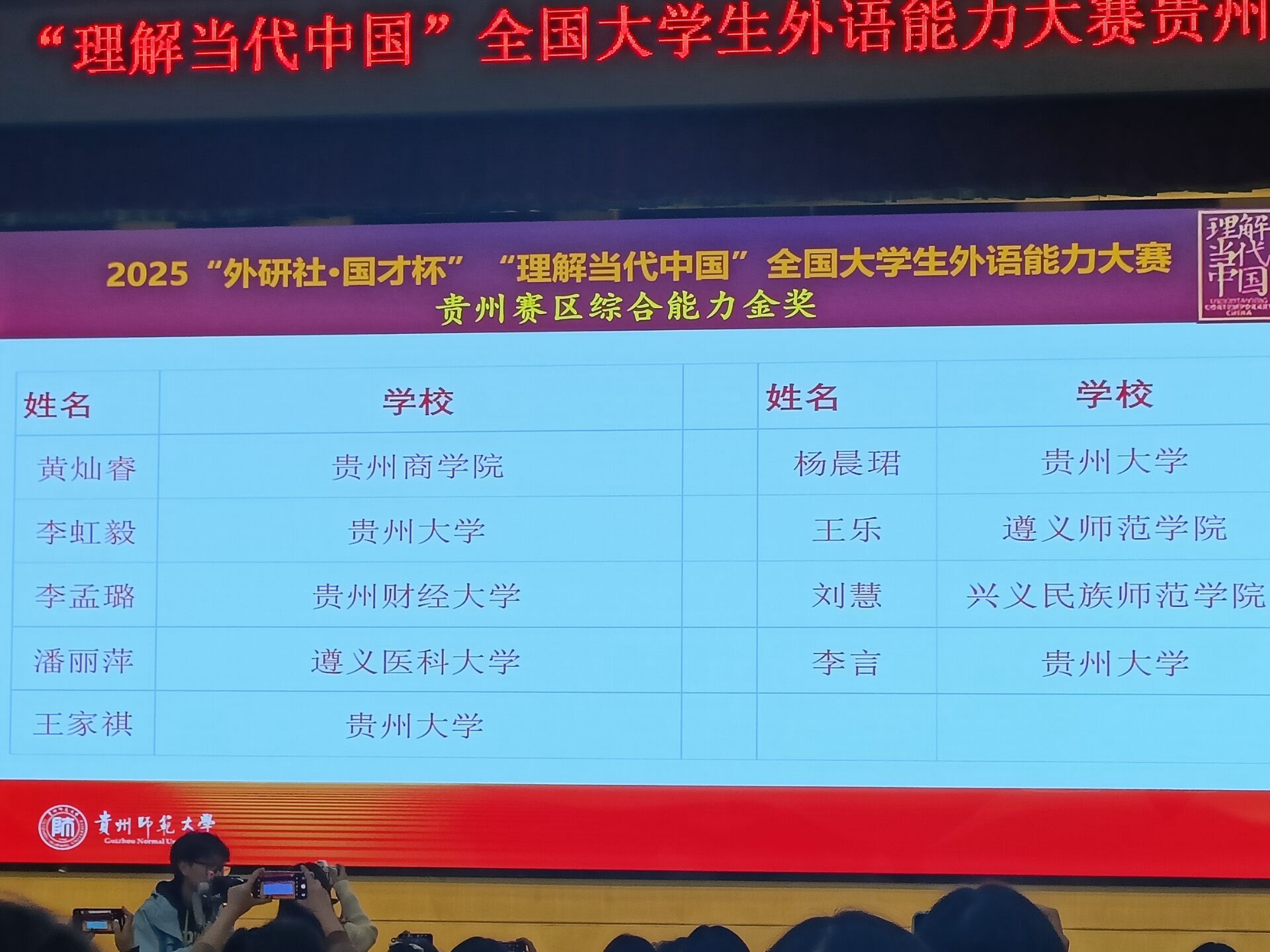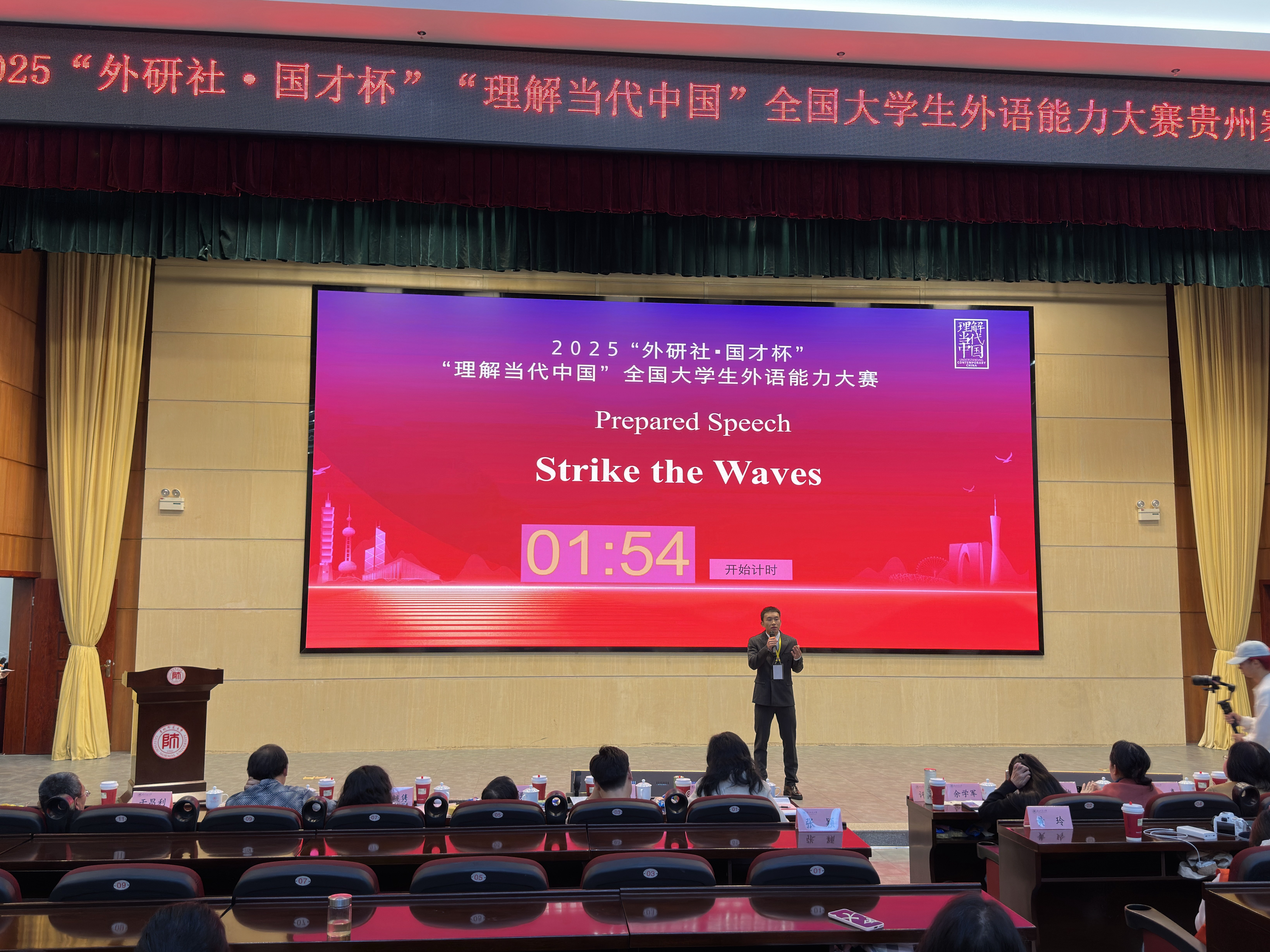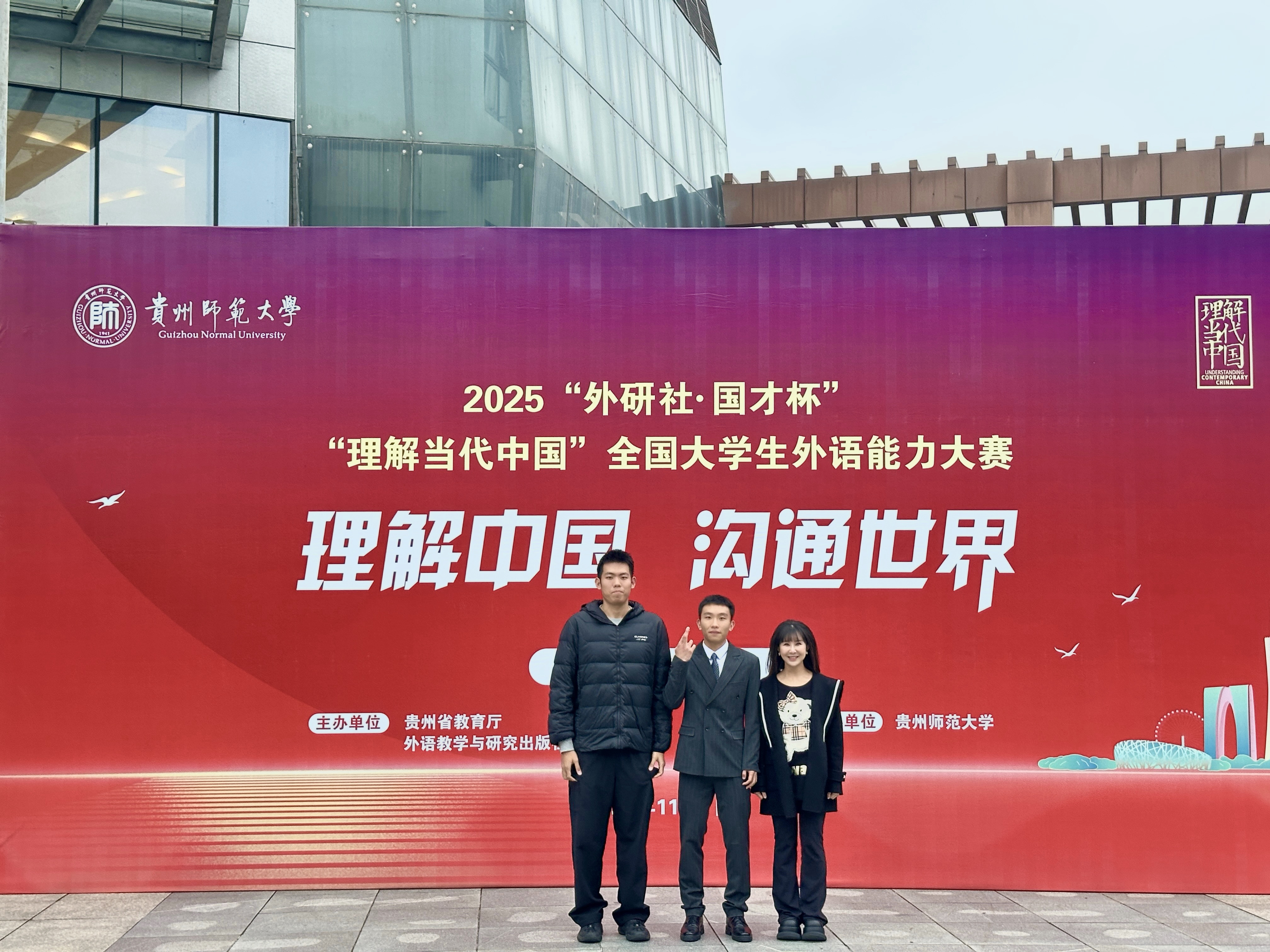 11月1日,由贵州省教育厅主办、外语教学与研究出版社协办的2025“外研社·国才杯”“理解当代中国”全国大学生外语能力大赛贵州省赛区选拔赛圆满落幕。由国际教育学院(大学外语教学部)教学团队指导的参赛选手荣获金奖1项,铜奖4项,优秀奖10项。其中,杨洋老师指导的大数据与智能工程学院2024级黄灿睿同学荣获综合能力赛项金奖,成功晋级全国总决赛,邹舟老师指导该同学荣获笔译赛项铜奖;杨婷老师指导的数字经济与金融学院2023级卢思汉同学获演讲赛项铜奖;黎倩老师指导的国际教育学院2025级季宸同学获综合能力赛项铜奖;常梦雪老师指导的2024级熊瑶团队获短视频赛项铜奖。