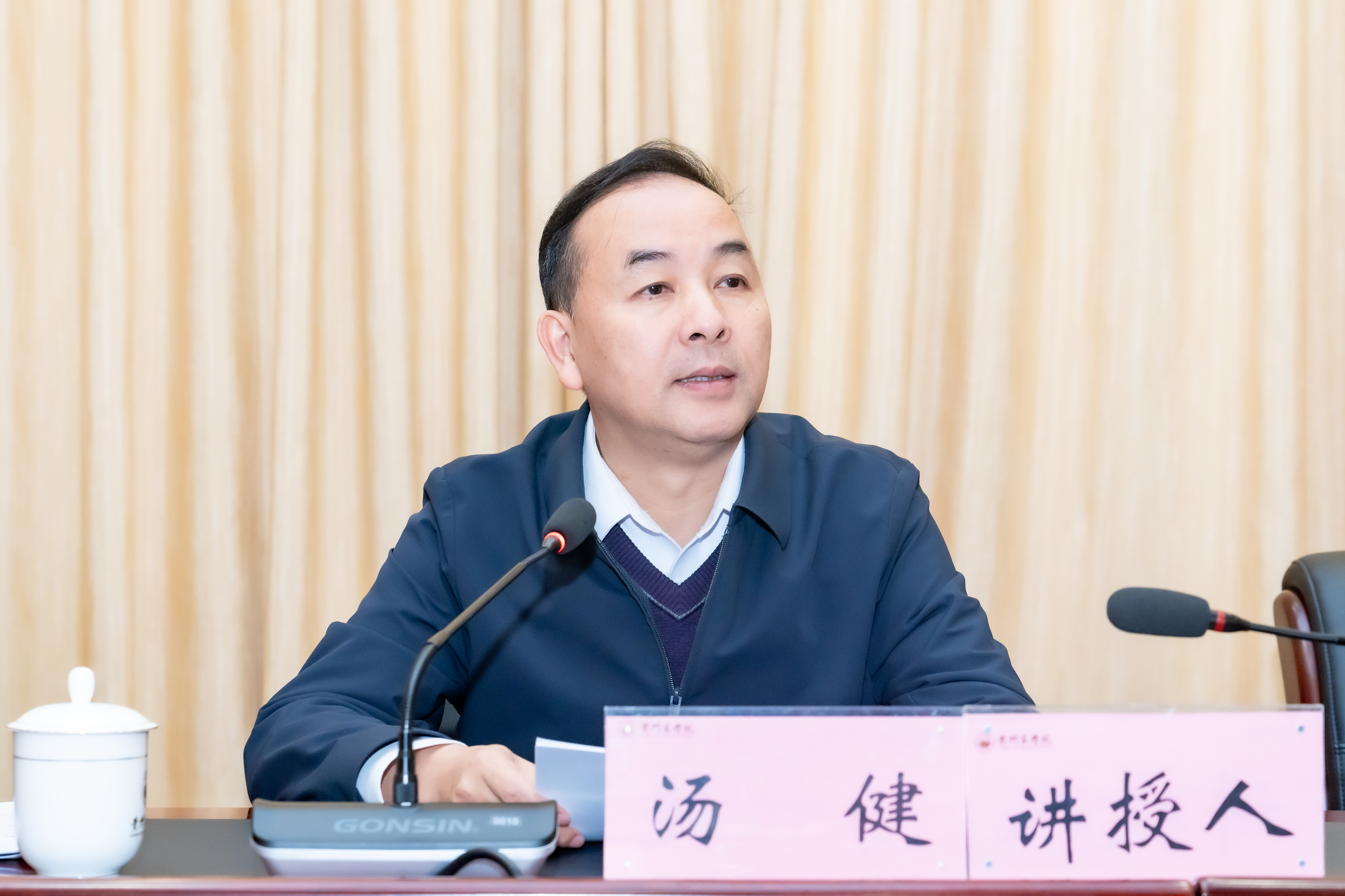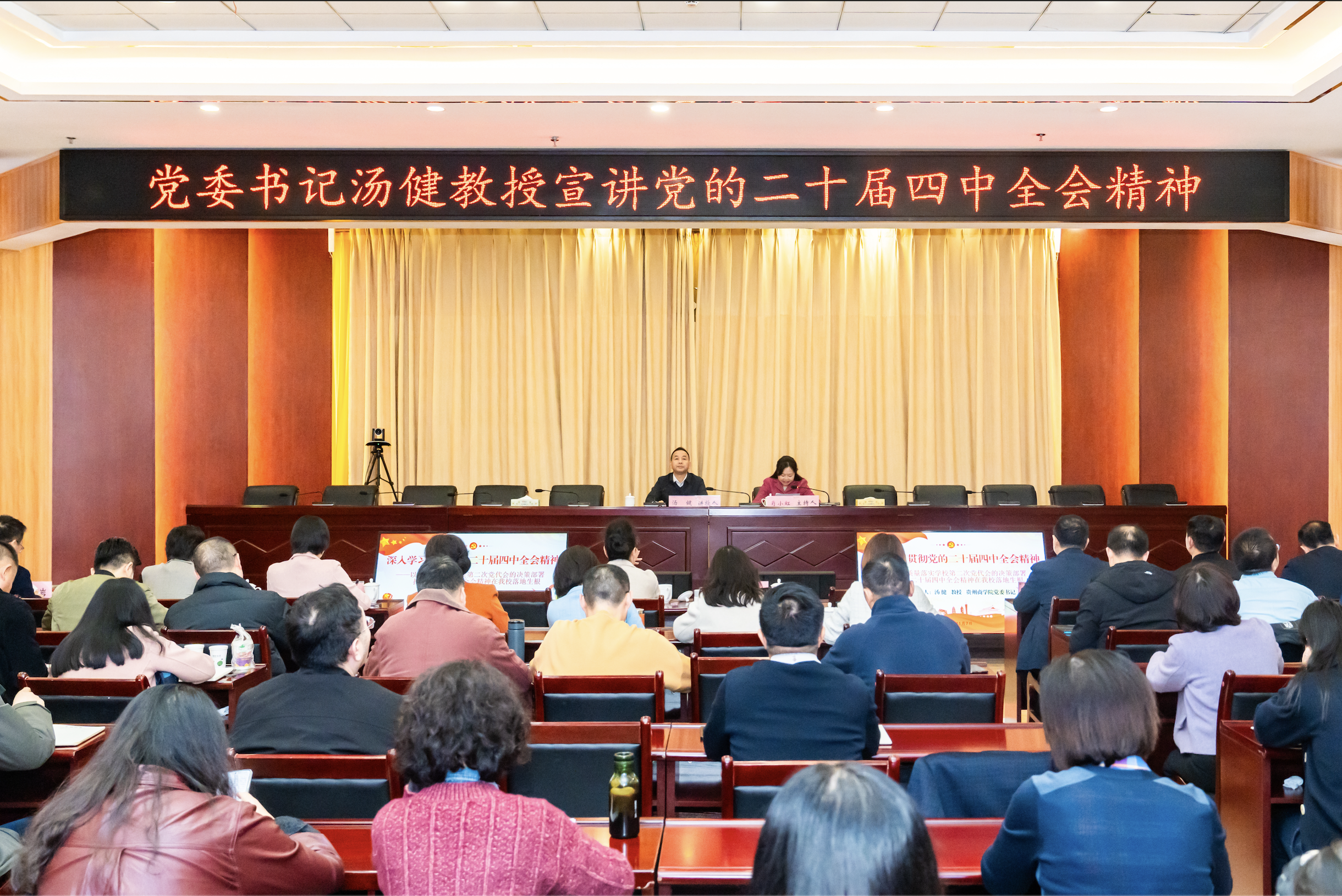 会上,党委书记汤健作了题为《深入学习贯彻党的二十届四中全会精神 以高质量落实学校第二次党代会决策部署推动党的二十届四中全会精神在我校落地生根》的宣讲报告。汤健系统梳理并深入解读了党的二十届四中全会的基本情况、重大意义、主要成果以及“十五五”时期经济社会发展的指导思想、基本原则、主要目标和重点任务。他强调,全会高度评价了“十四五”时期取得的重大成就,深刻分析了“十五五”时期面临的形势,为全面建设社会主义现代化国家指明了前进方向。全校各级党组织要深入学习领会全会精神,自觉把思想和行动统一到党中央决策部署和学校党委工作要求上来,以更加昂扬的斗志和更加扎实的作风,推动党的二十届四中全会精神在我校落地生根、开花结果。