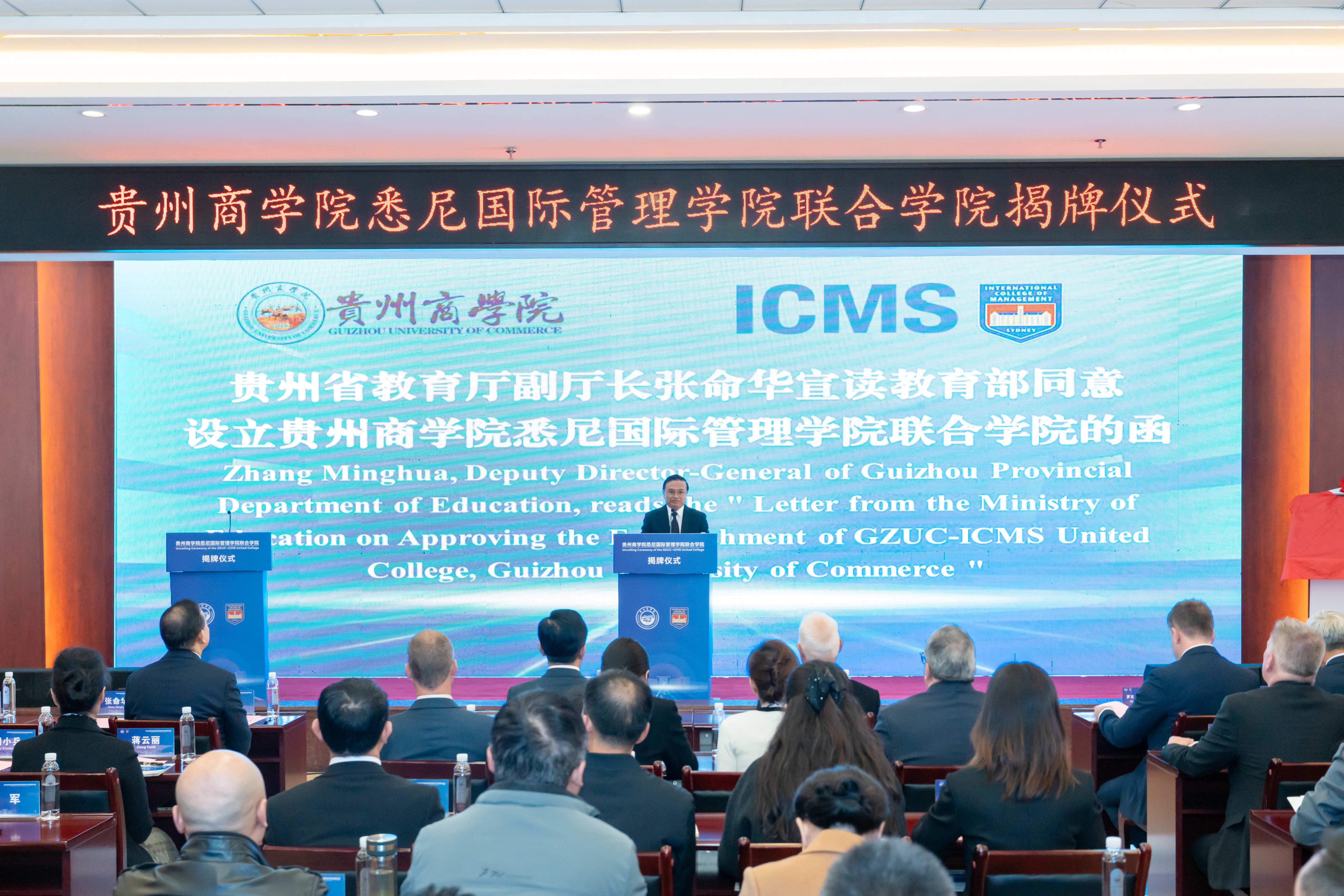 贵州省教育厅党组成员、副厅长张命华宣读教育部同意设立贵州商学院悉尼国际管理学院联合学院的函