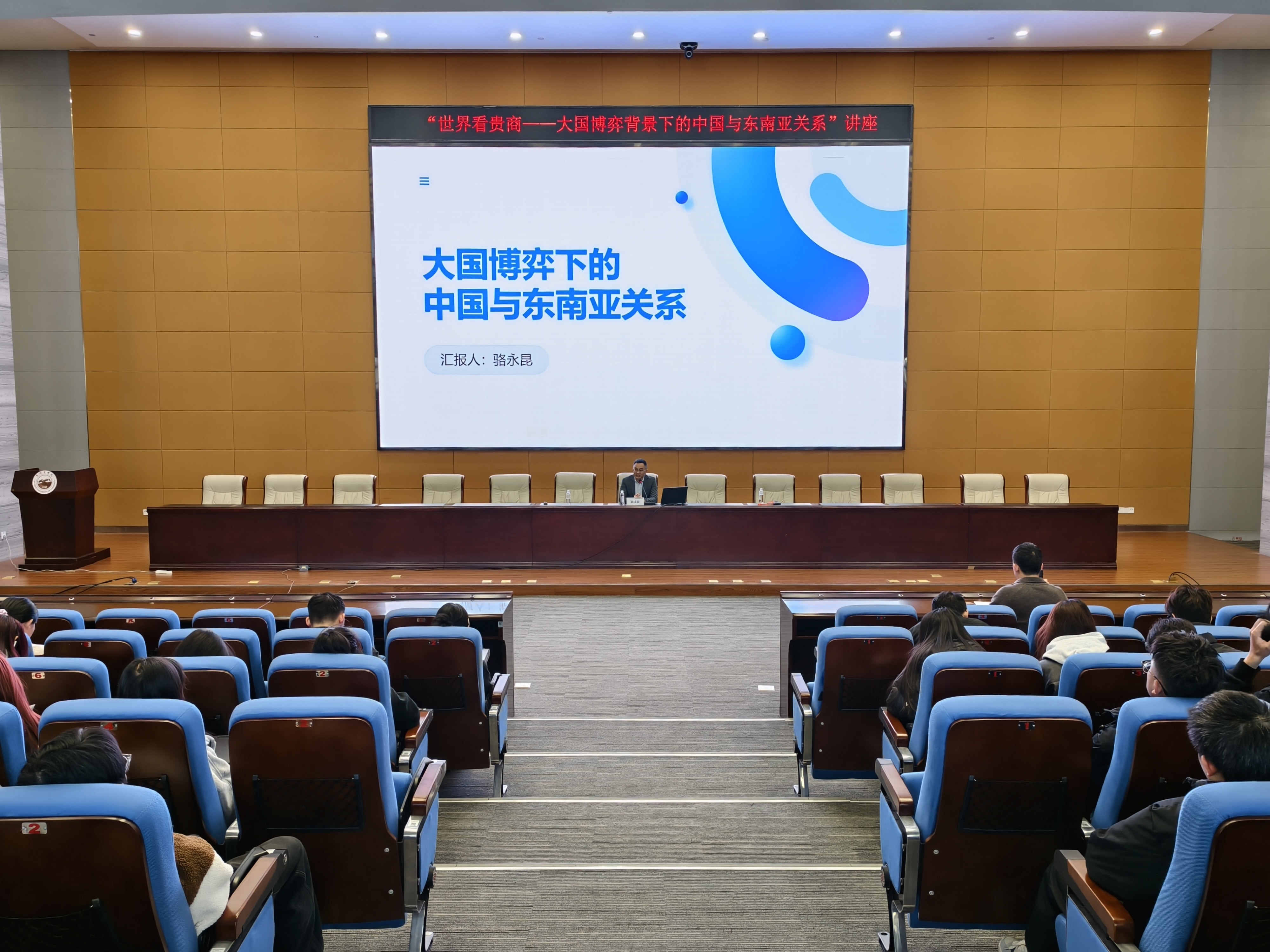 11月25日下午,“2025中国-东盟内陆开放经济合作与人才培养项目”平行活动“世界看贵商——大国博弈下的中国与东南亚关系”专题讲座在贵州商学院图书馆报告厅举行,全校师生代表260余人参加。