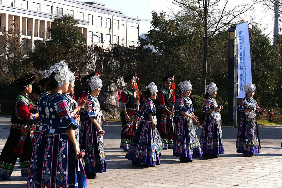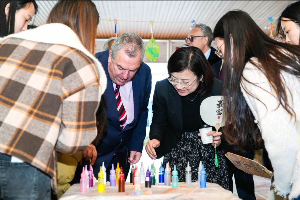 在后续文化交流环节,悉尼国际管理学院校方高层团队欣赏了文化旅游学院的学生带来的民族特色节目《踩鼓曲》,参与了由学工部组织的漆扇文化制作体验活动。