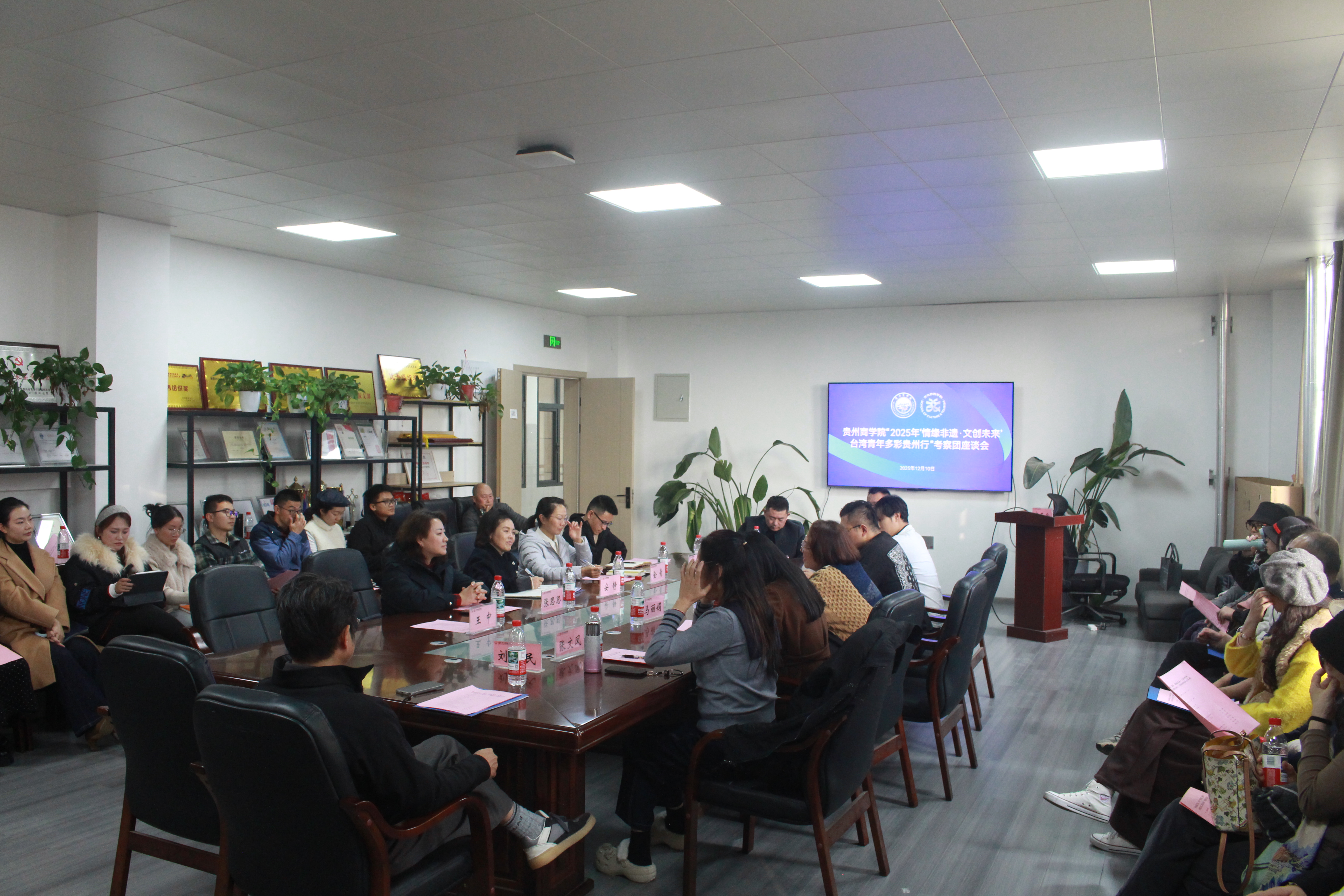 12月10日,“2025‘情缘非遗·文创未来’台湾青年多彩贵州行”交流座谈会在我校静心湖会议中心第二会议室举行。省委台办交流处处长张华、我校党委副书记胡小兵出席会议,台湾淡江大学华东校友会会长邱素蕙等台湾师生及企业家代表一行20人到校参访交流。招生就业处、文化旅游学院、对外交流合作处及实践教学中心相关负责人参加了相关活动。座谈会由招生就业处处长唐雪梅主持。