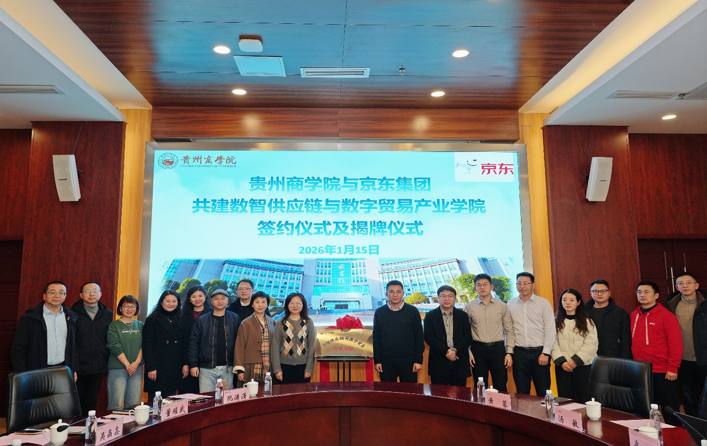 1月15日,贵州商学院与京东集团共建的“数智供应链与数字贸易产业学院”签约及揭牌仪式在静心湖会议中心第一会议室隆重举行。党委副书记、校长肖小虹与京东物流科技副总裁范广辉共同为产业学院揭牌,党委常委、副校长马红梅与京东教育产教融合负责人李凌分别代表学校和京东集团签署合作框架协议。