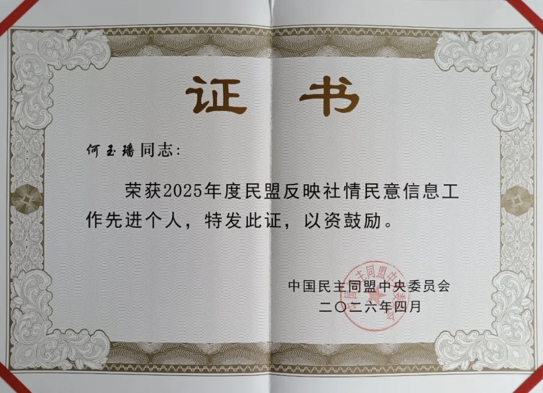 4月9日民盟中央2026年参政议政工作会议在北京召开。民盟中央副主席张道宏出席会议并讲话。我校教师、盟员何玉璠荣获“2025年度民盟反映社情民意信息工作先进个人”称号。