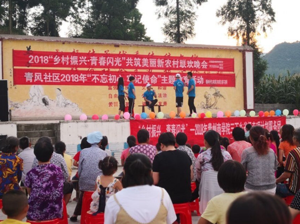 临别前夕,服务实践团与当地村民共同举办了2018“乡村振兴,青春闪光”共筑美丽新农村联欢晚会暨青风社区2018年“不忘初心,牢记使命”主题教育活动。志愿者们通过快板、小品、舞蹈、歌曲等表演形式使党的十九大精神与扶贫政策深入人心,同时也丰富了当地村民的文娱生活。
