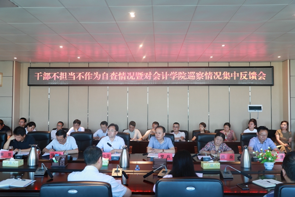 2018年7月20日上午,学院党委召开干部不担当不作为自查情况暨对会计学院巡察情况集中反馈会。院党委书记方仕平主持会议并讲话,党委巡察组对会计学院党总支的巡察情况进行了通报,院党委副书记侯贵生通报了开展干部不担当不作为专项整治自查情况。