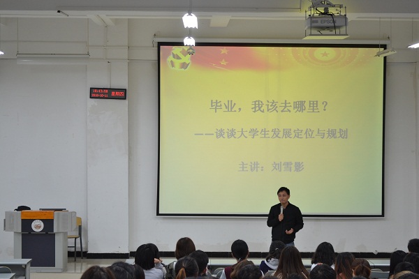 2018年10月11日下午18:30,尚信楼201阶梯教室不时传来阵阵笑声和掌声,刘雪影博士师应邀正在为管理学院同学们做题为《毕业,我该去哪里》就业创业主题讲座。