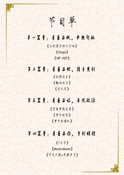 联欢会以“筑梦贵商,激情飞扬”为主题,分为“青春为帆,梦想起航”、“青春为帜,携手共创”、“青春为诗,乘风破浪”、“青春为你,争创辉煌”四个篇章,由大学生艺术团、艺术传媒学院及面向全院征集的优秀节目组成。整台晚会寄与了2018级新生美好期盼与祝福。
