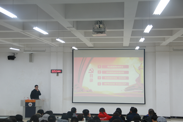 任文华博士先带领大家学习《宪法》的主要内容,阐明宪法在我国法律中的重要地位和作用,并重点强调宪法是我国的根本法,是最高行为准则,是其他法律的立法基础,其他法律不能与之相违背;同时,宪法在推动我国社会主义制度建设中起到重要作用。宪法不是一夜之间生成的,也不是完美无瑕的,它就像玉一样,需要不断的加工打磨,最终才能成为绝世好玉。宪法正是这样,在一代代中国领导人和中国人民的探索中得到不断发展的。任文华博士在谈到新中国宪法的发展历程时,语气变得沉稳有力,他说到:“我国的宪法同党和人民进行的艰苦奋斗和创造的辉煌成就是离不开的。”并引用现实中的典例,告诫大家作为中华人民共和国的公民,每一个人都有权利也有义务去维护宪法的地位,在维护宪法权威,捍卫宪法尊严的过程中要敢于恶势力斗争,绝不软弱退缩。