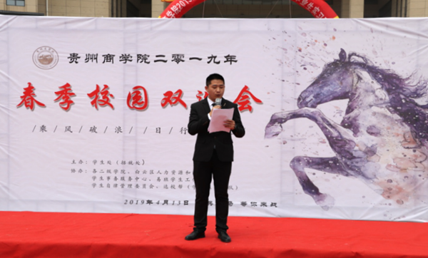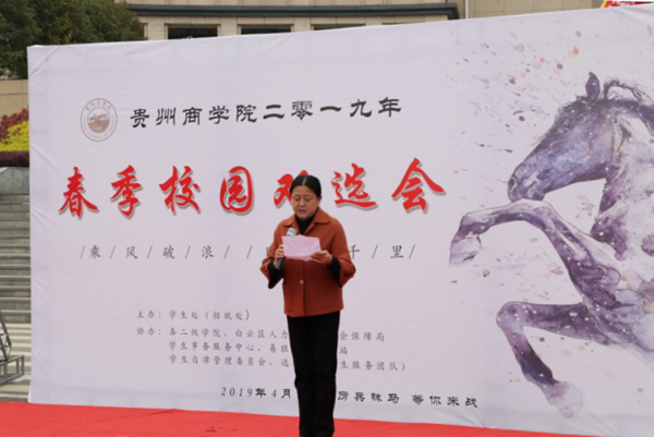 2019年4月13日下午,我院举办“贵州商学院2019届毕业生春季校园双选会暨2020届毕业生实习预招会”。开幕式上,学院党委委员、副院长吕泉致欢迎辞,北京华联综合超市股份有限公司西南大区人力资源总监赵峥嵘代表参会单位发言,管理学院物流15-3班杜佳衡同学代表2019届毕业生发言。