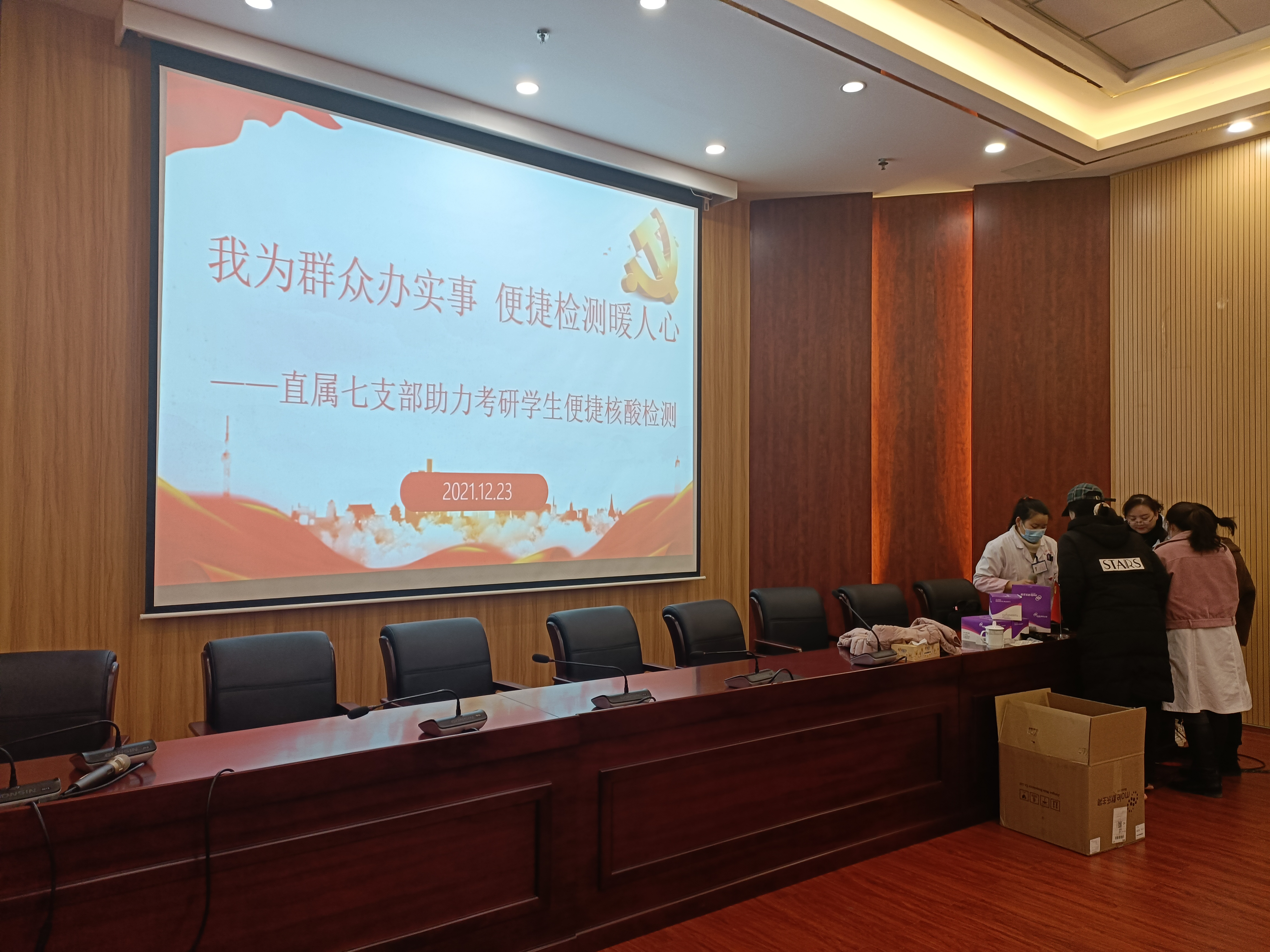 2021年12月23日下午,为了让参加今年全国硕士研究生招生考试的同学无后顾之忧,直属七支部联系麦架镇卫生院在湖滨会议中心第三会议室为同学们提供了集中核酸检测服务,现场秩序井然用较短的时间就完成了核酸检测采样工作。学生纷纷表示,学校此举考虑周到,为同学们提供了极大的便利,非常贴心,非常暖心。