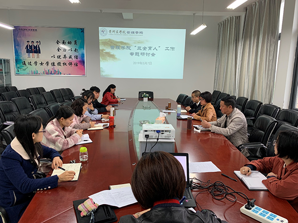 习近平总书记在全国高校思想政治工作会议上指出,要坚持把立德树人作为中心环节,把思想政治工作贯穿教育教学全过程,实现全员育人、全过程育人、全方位育人,为进一步学习和探讨推进管理学院“三全育人”专项工作,2019年5月7日上午,管理学院在会议室召开“三全育人”专题研讨会,进一步学习讨论“三全育人”工作。文大强副院长参加了研讨会。会议由管理学院党总支书记庞郁华主持。