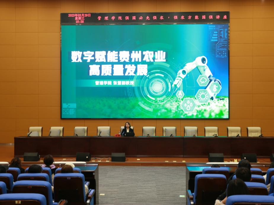 为让同学们了解数字农业赋能乡村振兴的重要意义,引导当代青年大学生助力贵州农业高质量发展,管理学院于2023年3月29日在图书馆汇报厅开展了“强国必先强农,农强方能国强之数字赋能贵州农业高质量发展”的学术讲座。本次学术讲座活动由副教授张雪主讲。
