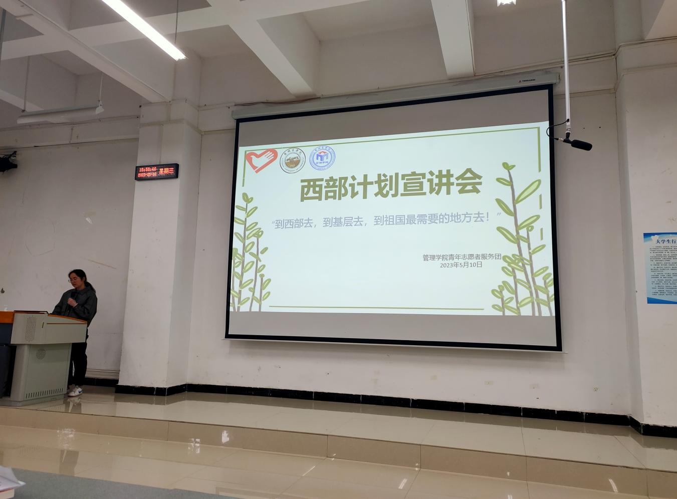 为积极响应中央“到西部去,到基层去,到祖国最需要的地方去!”号召,落实大学生志愿服务西部计划宣传工作,让大学生进一步了解“西部计划”,管理学院青年志愿者服务团于2023年5月10日在贵州商学院尚信楼阶梯教室102开展“西部计划”宣讲会。管理学院团总支负责人胡萍老师主持了宣讲会。